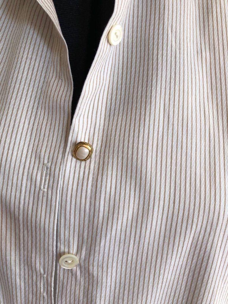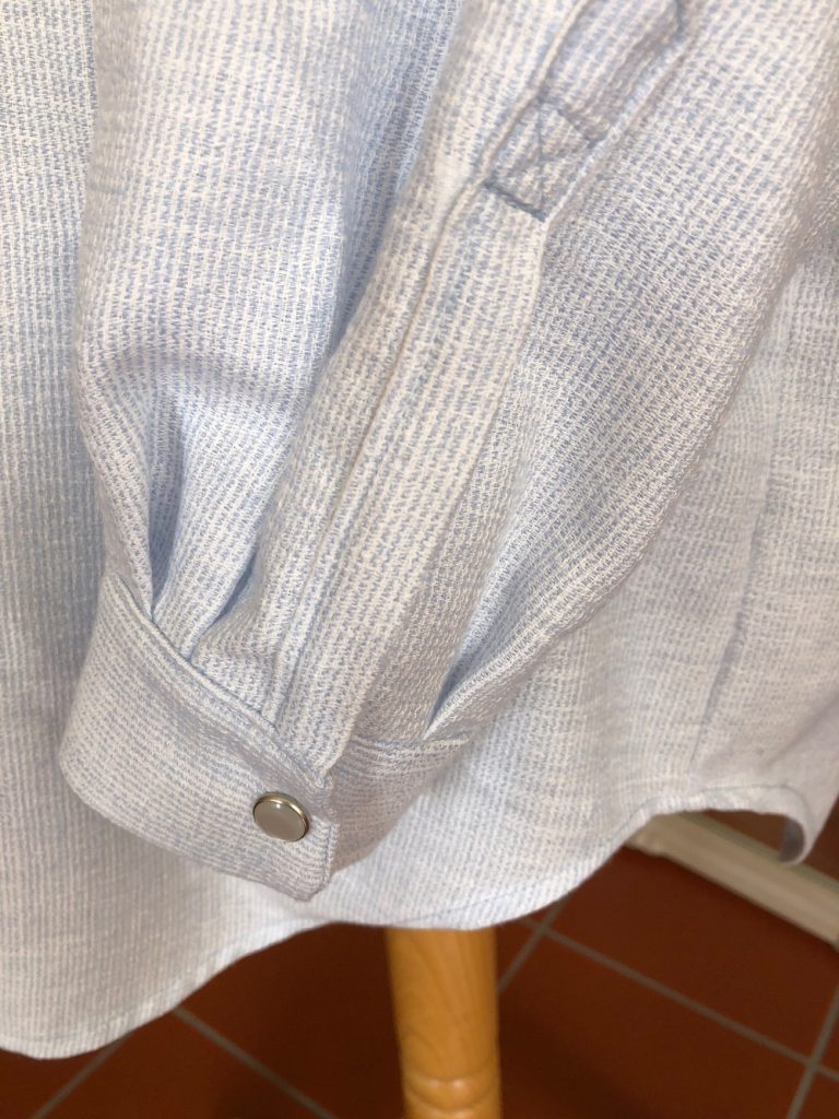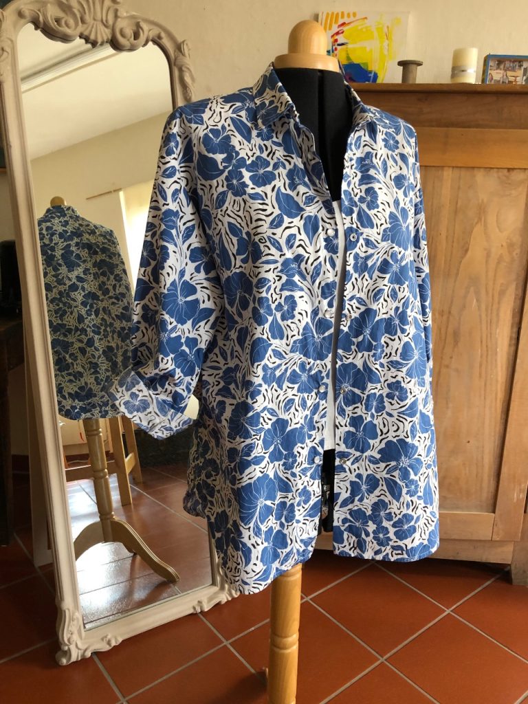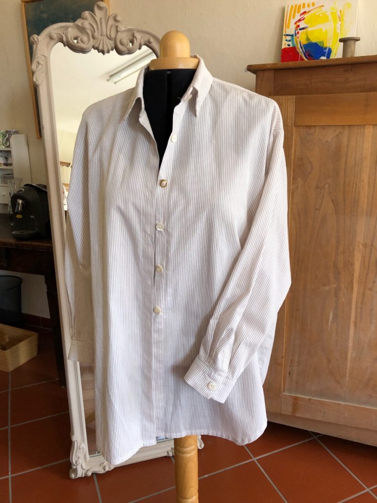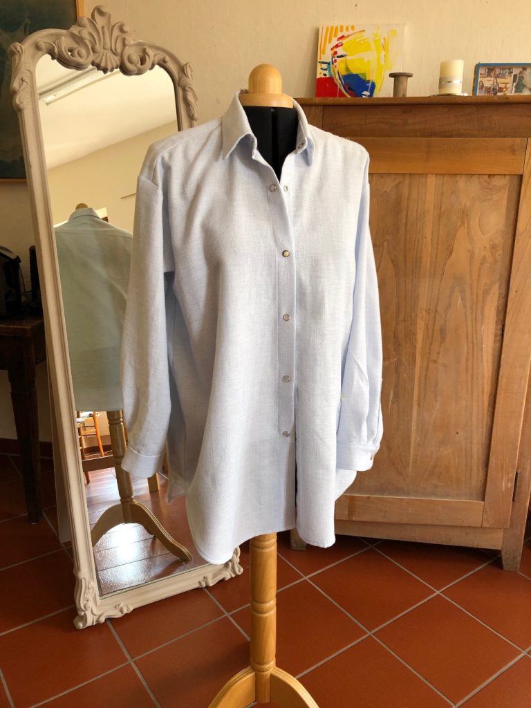 Quest anno mi piace di mettere delle camicie, allora me ne sono fatta a bracciate. Quella del titolo ho fatto su misura molto comoda con un cotone leggermente elastico. Per i giorni caldissimi ho fatto un modello oversize e perché mi è piaciuto tantissimo ne ho fatto tre! Sembrano camicie da uomo e gli ho messo piccolissimi dettagli femminile.